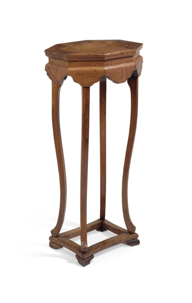 晚明〈黃花梨四足葉紋八方高香几〉以1973萬5000港元位列第一,本香几曾為香港敏求精舍成員鍾華培所藏,在1995年香港藝術館「好古敏求─敏求精舍三十五週年紀念展」展出。香几八方几面攢邊打槽平鑲獨板面心,下裝一根穿帶出梢支承,三彎腿足弧形舒斂有致,於底向外微翻出蹄足。1600萬落槌,由中國瓷器及藝術品部主管曾志芬為客戶帶回。