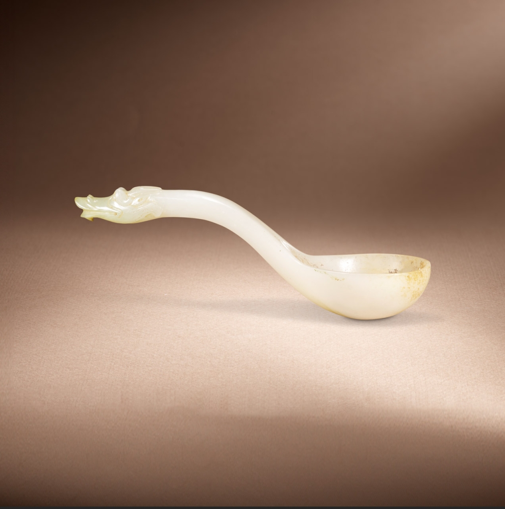 - 西漢晚期至東漢〈白玉龍首勺〉,長16.8公分,估價50萬至80萬港元,成交價2215萬5000港元,超低估價44倍。