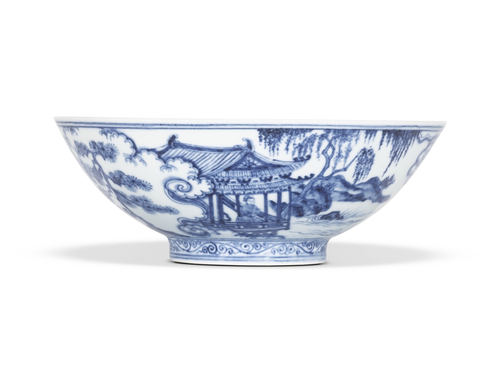 本場大樑由明宣德〈青花吹簫引鳳圖盌〉擔任,估價2500萬至3500萬港元,成交價3062萬5000港元,乃佳士得香港本季器物之王。此盌為清翫雅集成員舊藏,於史博館清翫雅集廿周年慶收藏展曾展出。盌侈口,弧壁,矮圈足。外壁繪通景山水樓閣圖,樓閣內一仕女吹簫,迎面一仙女乘鳳駕雲而至,圈足畫卷草紋一周,青花色澤勻濃,胎質堅細。此盌之紋飾題材取自神話故事,又稱「吹簫引鳳圖」,可引申為表達對美滿姻緣的祈願。