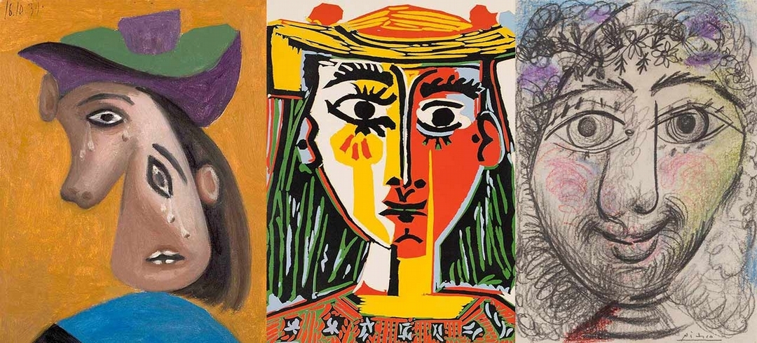 左起:畢卡索(Pablo Picasso), 《哭泣的女人》(Weeping Woman,1937)、《戴帽拿着絨球和印刷罩衫的女人肖像》(Buste de femme au chapeau)、《TETE》。(iART提供)