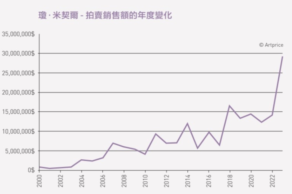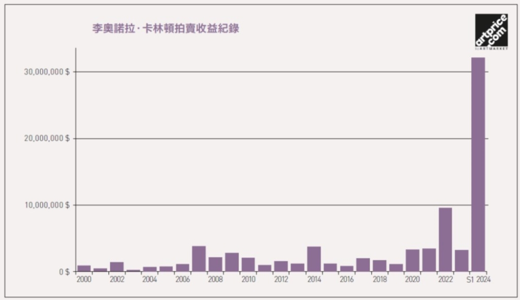 女性藝術家的市場發展穩定。自2014年以來,雖然全球市場的成交額縮減了46%,但是女性藝術家的部分卻增加了40%。10年內,女性的銷售額成長了一倍,2024年達到1萬5,519筆,但是百萬美元等級的銷售只佔了15%,因此,她們在最高端市場的身影依舊罕見。在Artprice的2024年前50大行情最高的藝術家中,只有四名是女性,佔比僅有8%,包括草間彌生(1億5,840萬美元)、瓊.米契爾(Joan Mitchell,1億230萬美元)、李奧諾拉.卡林頓(5,350萬美元)和喬治亞.歐姬芙(Georgia O’Keeffe,2,820萬美元)。