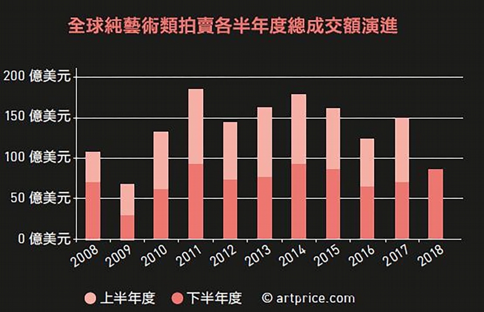 全球純藝術類拍賣各半年進度總成交額演進。(artprice提供)