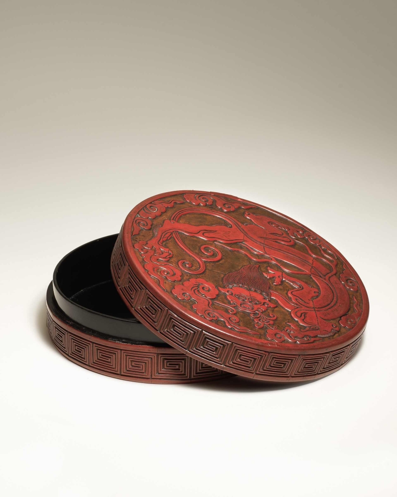 此剔紅圓盒,盒蓋雕一螭龍口銜靈芝,雙目炯然,四肢伸展勁健,尾部呈卷草狀,周圍祥雲環繞,盒與蓋直壁環飾回紋。整體飾紋襯以黃色漆地,盒內及底部髹黑漆。螭龍紋飾古意深淵,《呂氏春秋》載孔子曾自比螭龍。螭龍紋裝飾於漆器之上,約始見於宋,至明代早期尤為盛行。本拍品經Art-Science Consulting 海格洛赫,放射性碳定年法檢測,編號ETH 34605-01231107(2008年2月10日),結果與其斷代相符。本品是目前已知唯一一件裝飾單一螭紋之例,稀罕可珍。