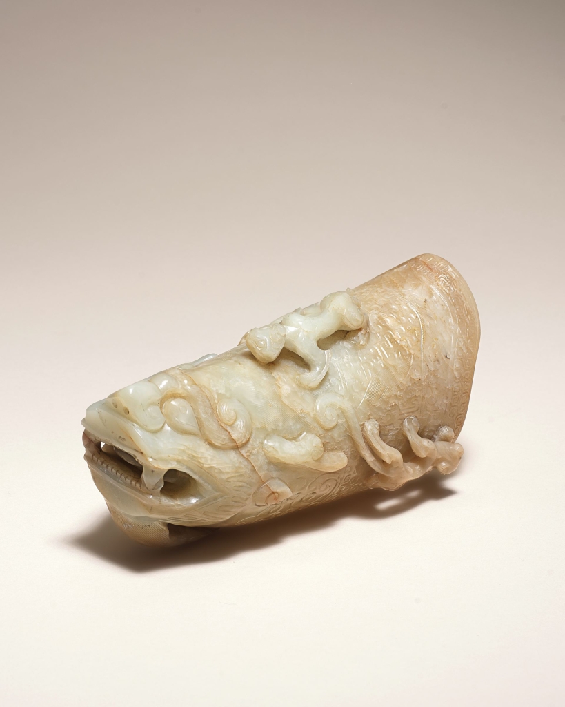 元/明〈灰青玉螭龍紋龍首觥〉,高16公分,估價4萬至6萬英磅。圖/倫敦邦瀚斯。