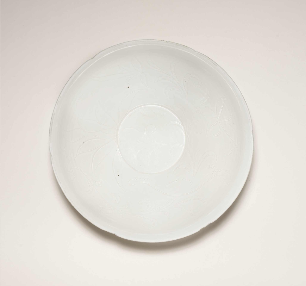 本碗胎骨輕薄,巧塑六瓣葵花形。通體施白釉,覆燒成器,口沿無釉。外壁光素,碗內刻劃蓮花紋,花葉造型優雅舒展,刀法流暢而不失婉約。北宋時期,定窯已臻燒造巔峰,所出精良之器,常供御用。此碗充分體現北宋定窯器物的清雅格調,尤以體量碩大而殊為可貴。
