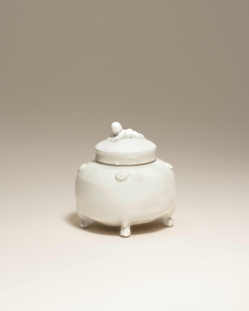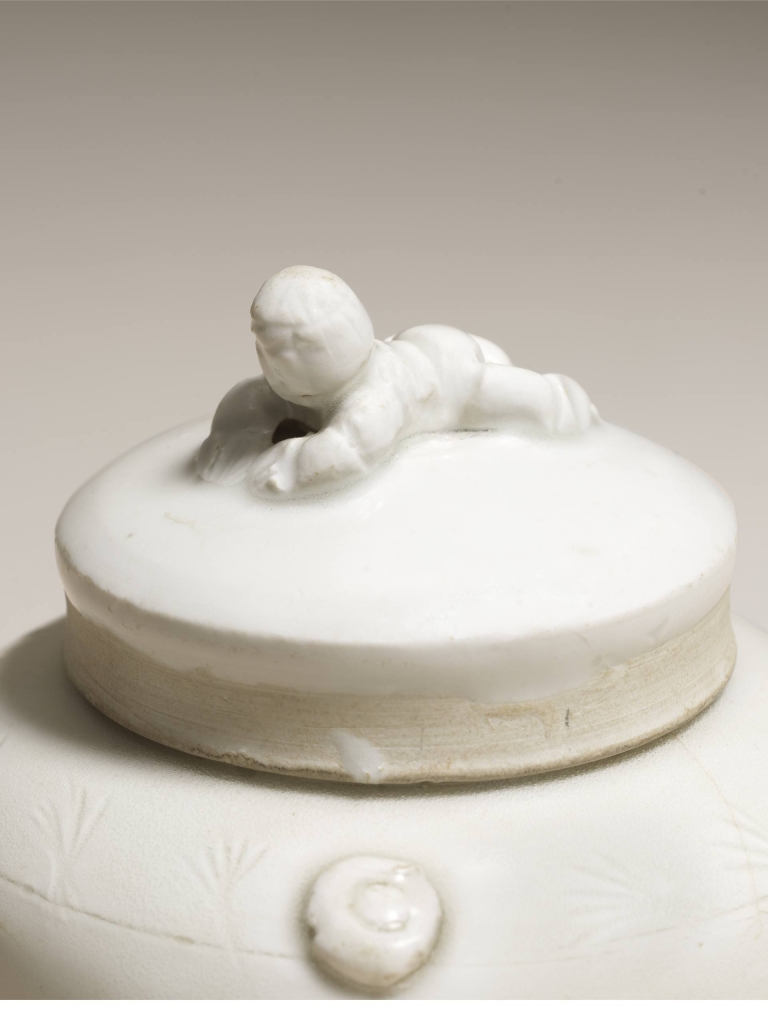 9/10世紀〈白釉獸足臥童鈕蓋罐〉局部,高11.2公分,估價4萬至6萬英磅。圖/倫敦邦瀚斯。