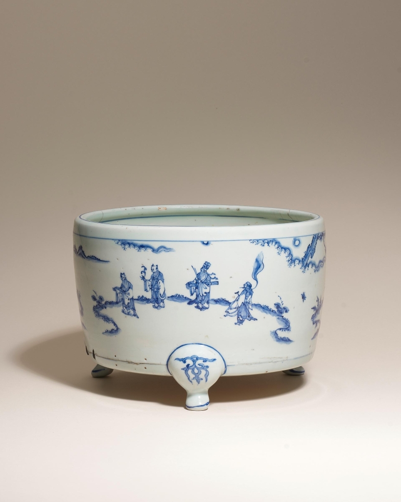 此器腹部微鼓,口沿內收,下承三蹄形足。爐身外壁以鈷藍繪通景山水,人物三組:兩組分別繪八仙中四位人物,分侍其間;一組繪壽老端坐香爐旁,松枝垂覆,有仙鶴、鹿和童子分侍左右,神態悠然。各組人物間繪卷雲繚繞,遠山隱現。成化御窯瓷器存世極為稀少,尤以此類大尺寸器物更顯重要。本品雖體量宏大,卻仍保持成化御窯小件一貫的細膩與雅致,爐身的廣闊空間亦使山水仙境的描繪尤為開闊,意境深遠。