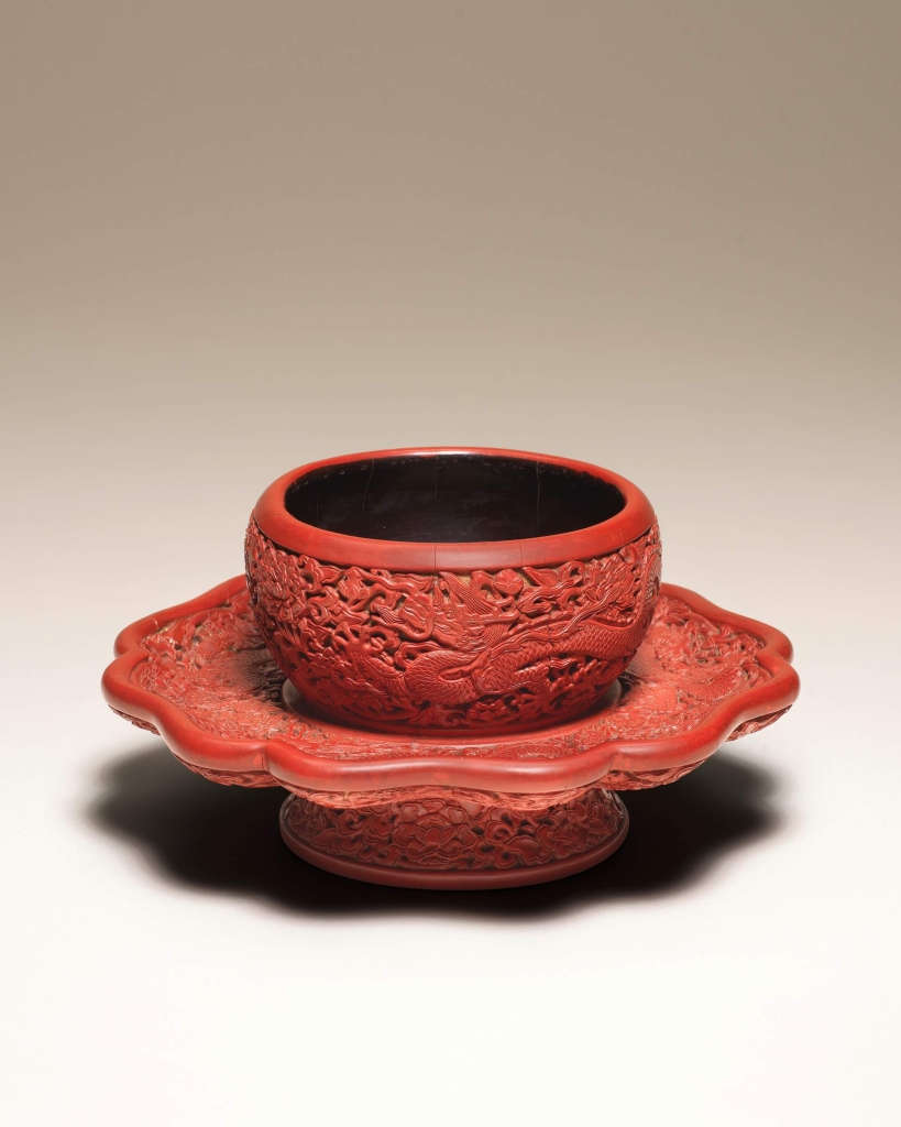 作高圈足葵花式六瓣托盤,上接中空無底圓形碗。精工雕刻厚髹朱漆至黃漆底之上,盞外壁及盤心飾五爪龍紋騰躍穿行於蓮花和纏枝葉蔓之間。盤外壁及足同雕纏枝蓮紋。碗內與足內髹以黑漆,足底右側針劃「大明永樂年製」款。明代早期剔紅漆器極為稀見,本件永樂剔紅龍紋碗托更為特殊,乃目前所知永樂時期唯一存世的龍紋剔紅碗托。另一件15世紀的剔紅龍紋碗托,為宣德款,原為李氏家族舊藏,2009年12月1日於香港佳士得釋出。