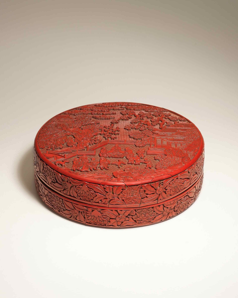 明永樂〈剔紅八仙人物圖蓋盒〉,「大明永樂年製」楷書刻款,徑31.5公分,估價30萬至50萬英鎊。圖/倫敦邦瀚斯。