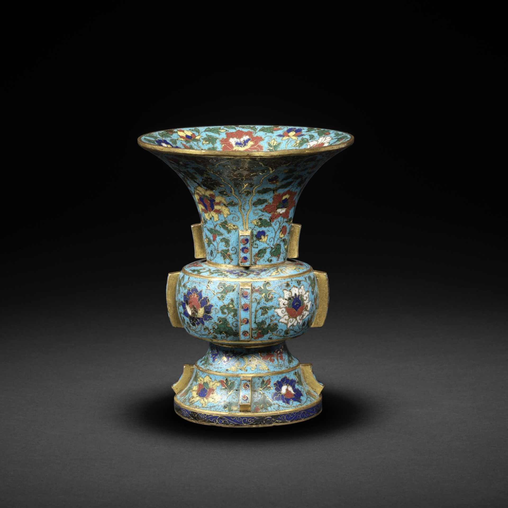 明宣德〈銅胎掐絲琺瑯纏枝花卉紋出戟尊〉,高18.5公分,估價18萬至24萬英鎊。圖/倫敦邦瀚斯。