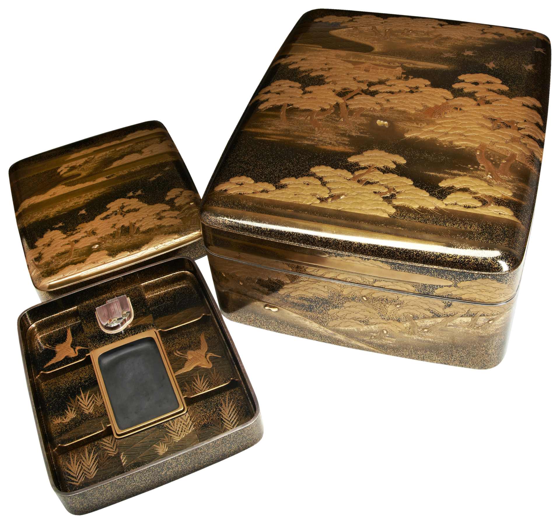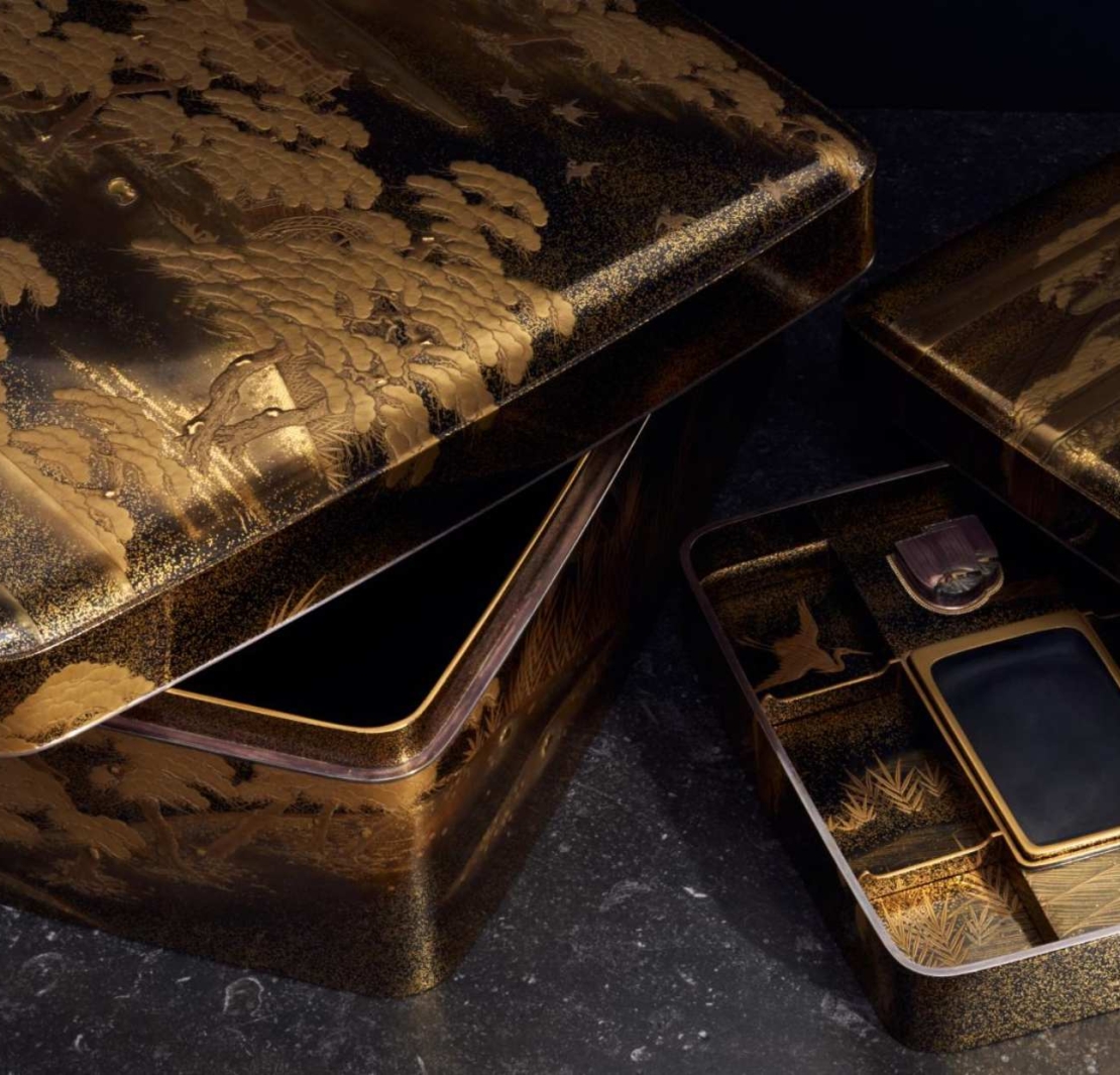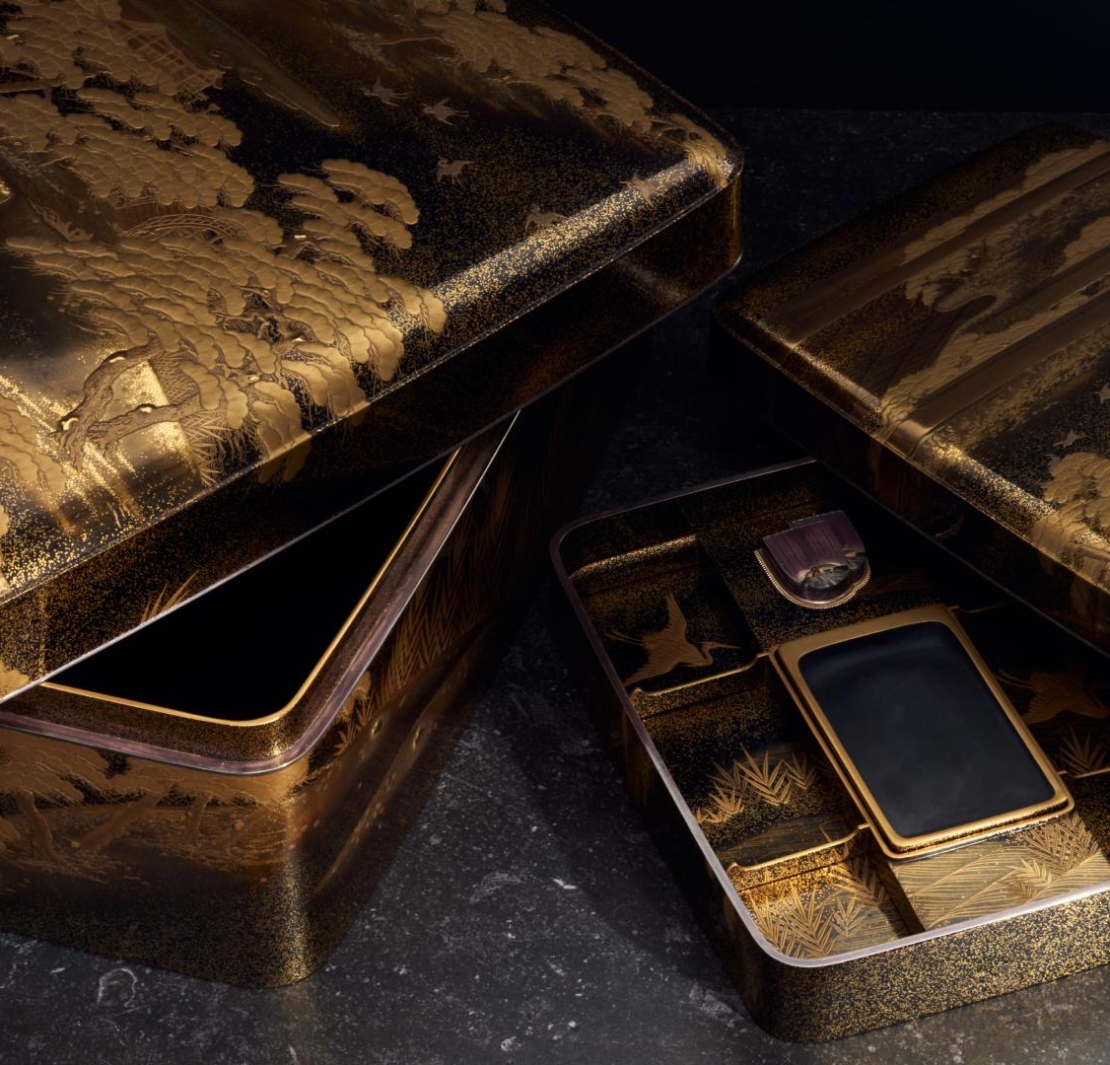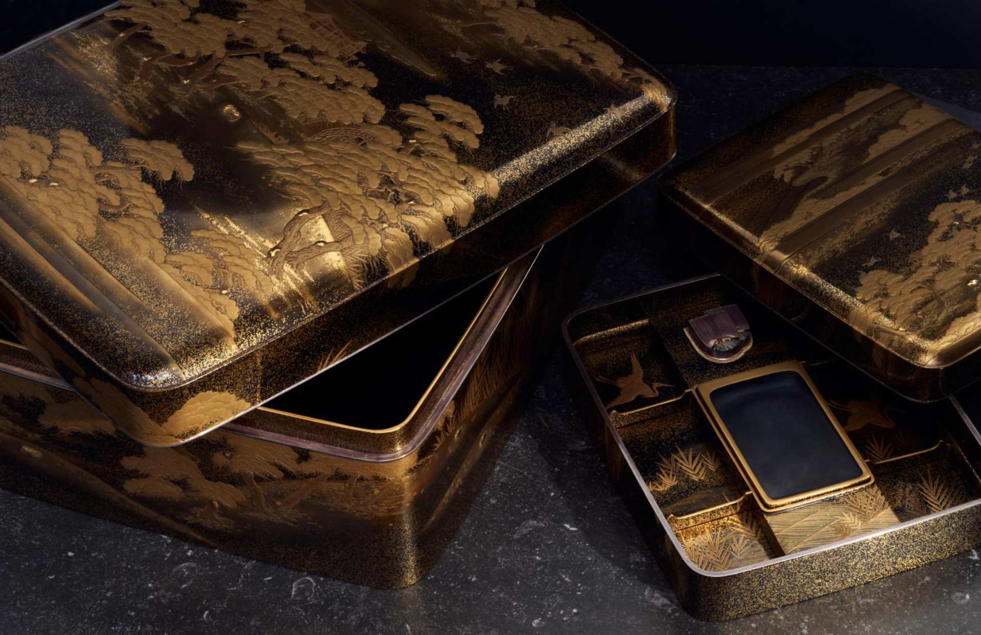 漆器收藏部分得益於與Lesley Kehoe的合作。她是備受日本政府認可的文化大使級畫廊主,致力於在日本發掘珍稀漆藝作品。1987年,透過她購入一對壯麗的江戶時期漆盒,上繪住吉大社松林海岸及其風景。此盒兼具藝術與歷史價值,收藏家以守護者自居,35年來幾乎未曾示人。可以說,它們在長達約250年的歷史中,如今或將首次公開亮相於世人眼前。