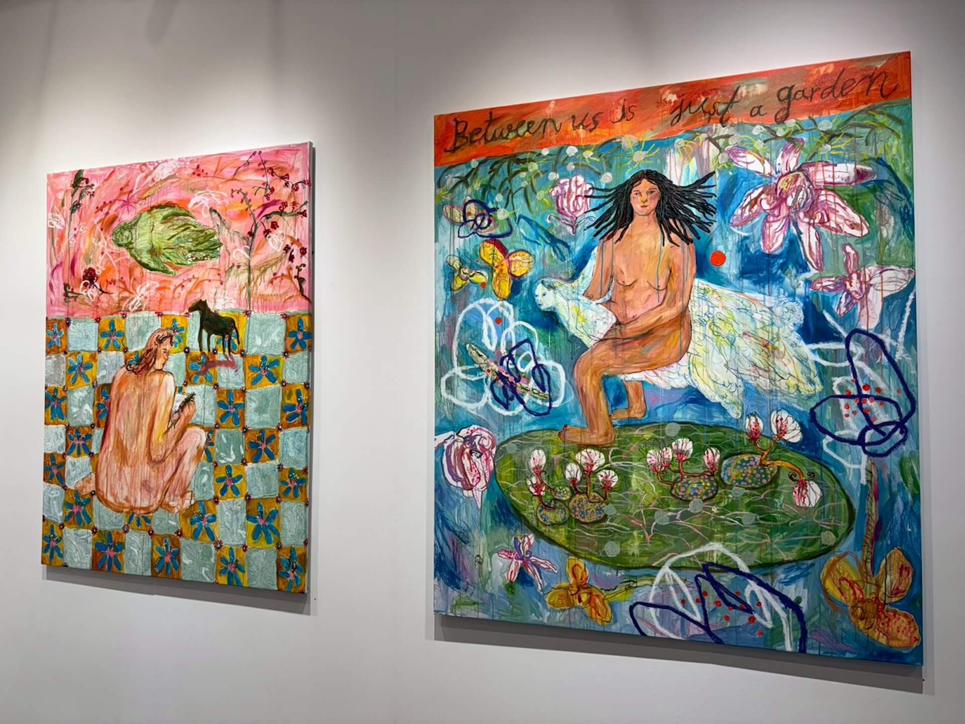 生於 1993 年的 Juli Baker and Summer,作品風格強烈,以鮮明飽和的色彩、純粹奔放的筆觸以及自由獨立的女性形象著稱,畫面洋溢著一股「陽光派對」般的生命力。她的作品中也頻繁出現她的筆跡、手寫文字或詩句,這種文字與圖像的並置,強化了作品的敘事深度,讓她同時扮演了畫家(圖像的敘事者)和作家(文字的書寫者)的角色,使觀者能更直接地與她的內心世界進行對話。