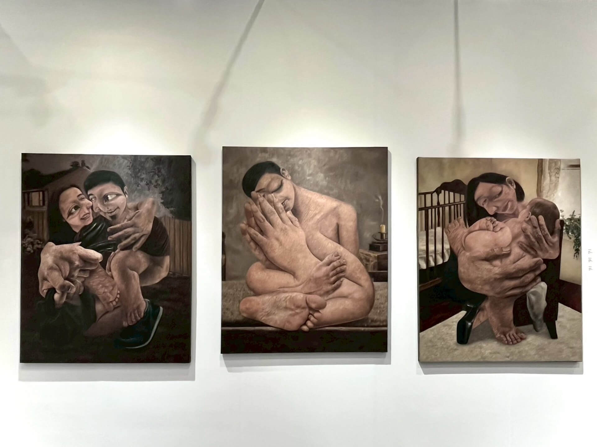 本次展出 Ryan Jara 的三幅作品,中央《祈禱》中的人物雙手覆面,凹折的身體呈祈禱姿;兩側左為逃逸的戀人《私奔》,右為象徵庇護的母與嬰《家/歸所》。畫面光線雖柔和,卻潛藏壓抑的陰影,一眼望去便感受到一種強烈而近乎變形的親密感。同時,在局部肌理上,又以十分細緻筆觸描繪。儘管仍保留可辨識的形體,但畫面中的人物在比例與形體上被誇張拉伸:巨大的手腳、交纏的軀體、兩張貼近卻顯扭曲的臉孔,令人難以「寫實」觀看。