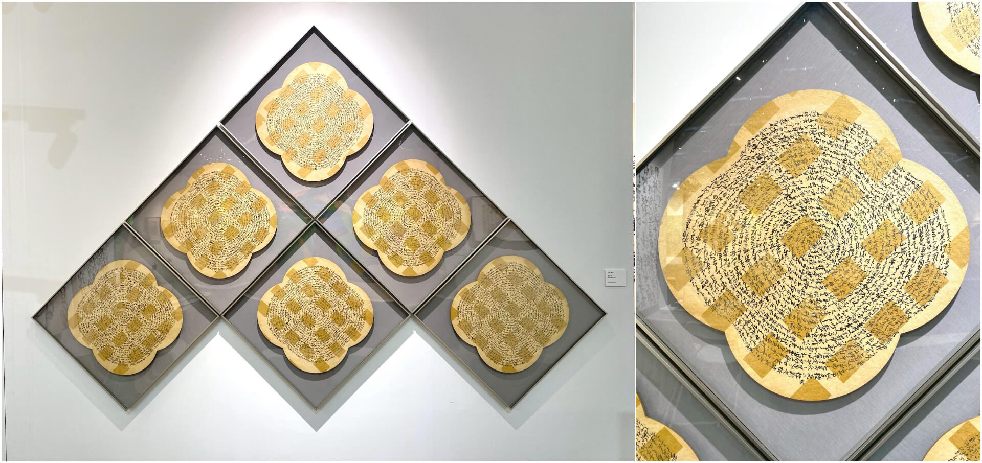 如今為人所津津樂道的卜兹晚期之作,以其恣肆揮灑的旋書狂草為最。而他潛心於《道德經》的研讀與體悟,又再再透過其書藝而試圖連結萬物根本之道。此次羲之堂在ART TAIPEI展位入口醒目位置佈局的卜茲書藝作品,具有難得一見的特殊形式:六件對稱拼接的作品,每件以因循紙張邊界的同心環格局,順時針書寫《道德經》,其上再敷以狀若坤卦的半透明金箔。字句收尾相接,環狀結構彷彿無始無終,遠觀酷似年輪,其作品名「美生美」也呈首尾循環格局。書藝研究家林俊臣認為「追求書寫之無罣礙的卜茲」,應當不會刻意謀劃和追求所謂當代書法的先鋒性。在這件形式與格局獨特的作品中,其實驗性或許也是一種「無意合拍」,卻絲毫不減其魅力。(文/嚴瀟瀟)