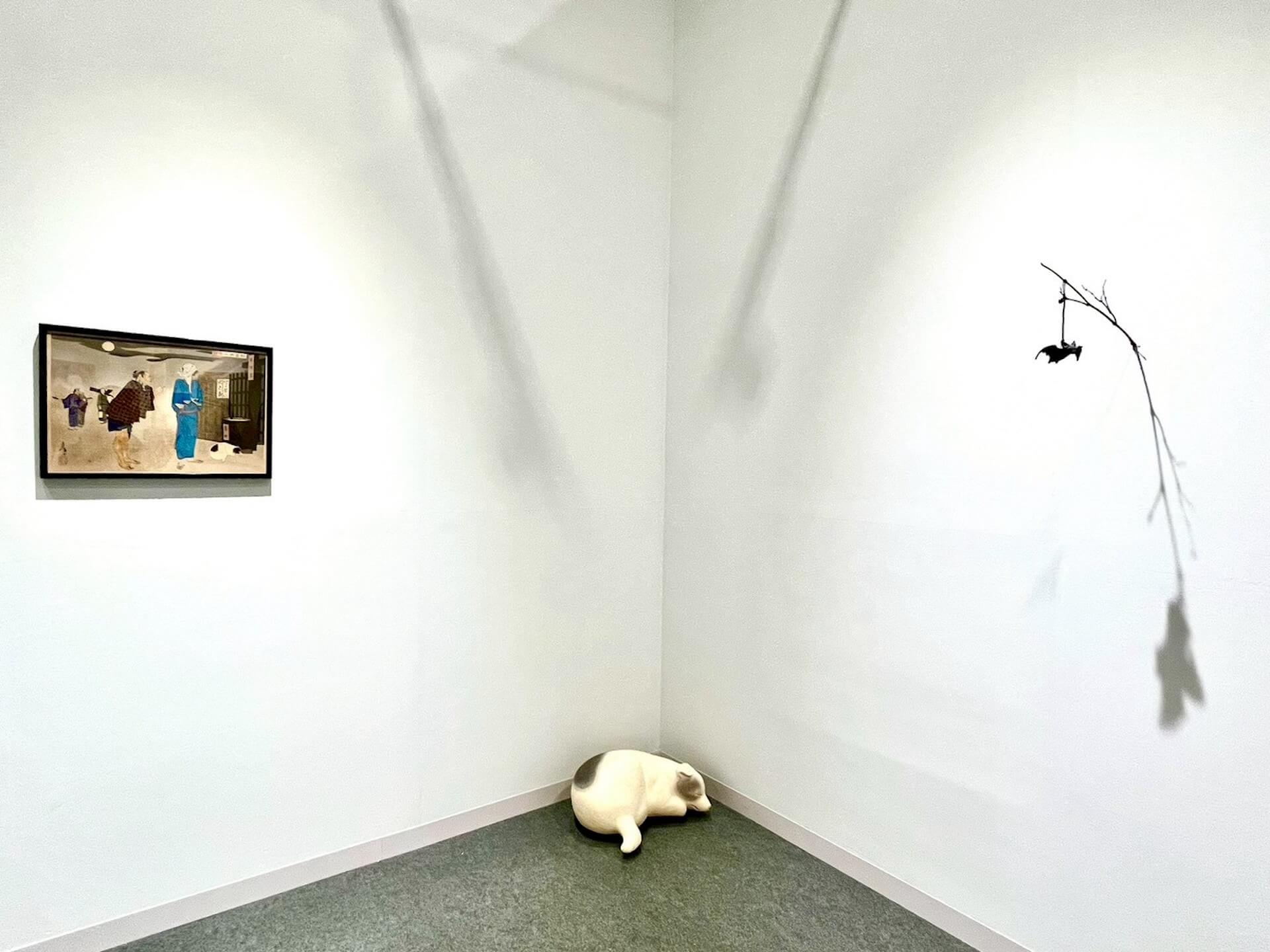 現場展品取材自浮世繪畫師月岡芳年在明治18年(1885)創作的《新撰東錦繪》系列當中描述富家少爺與三郎和已是他人小妾的藝妓阿富的波折戀情之故事。她以其中一幕〈於富與三郎話〉畫面右下方蜷曲睡覺的小狗,以及男子臉上的蝙蝠刺青為靈感,由平面圖像轉化為兩件木雕《眠り犬》、《蝙蝠》。小狗雕塑被放置於展場角落,重現其不受外界打擾的熟睡狀態;而造型圓潤小巧的蝙蝠也翻轉多數人視其陰暗可怕的形象,以懸吊於牆面而微微擺盪的輕巧狀態。兩件當代雕塑與浮世繪原作以組合形式共賞,在古典與當代之間推展出再現、記憶與情感的豐富敘事可能。(文/楊椀茹)