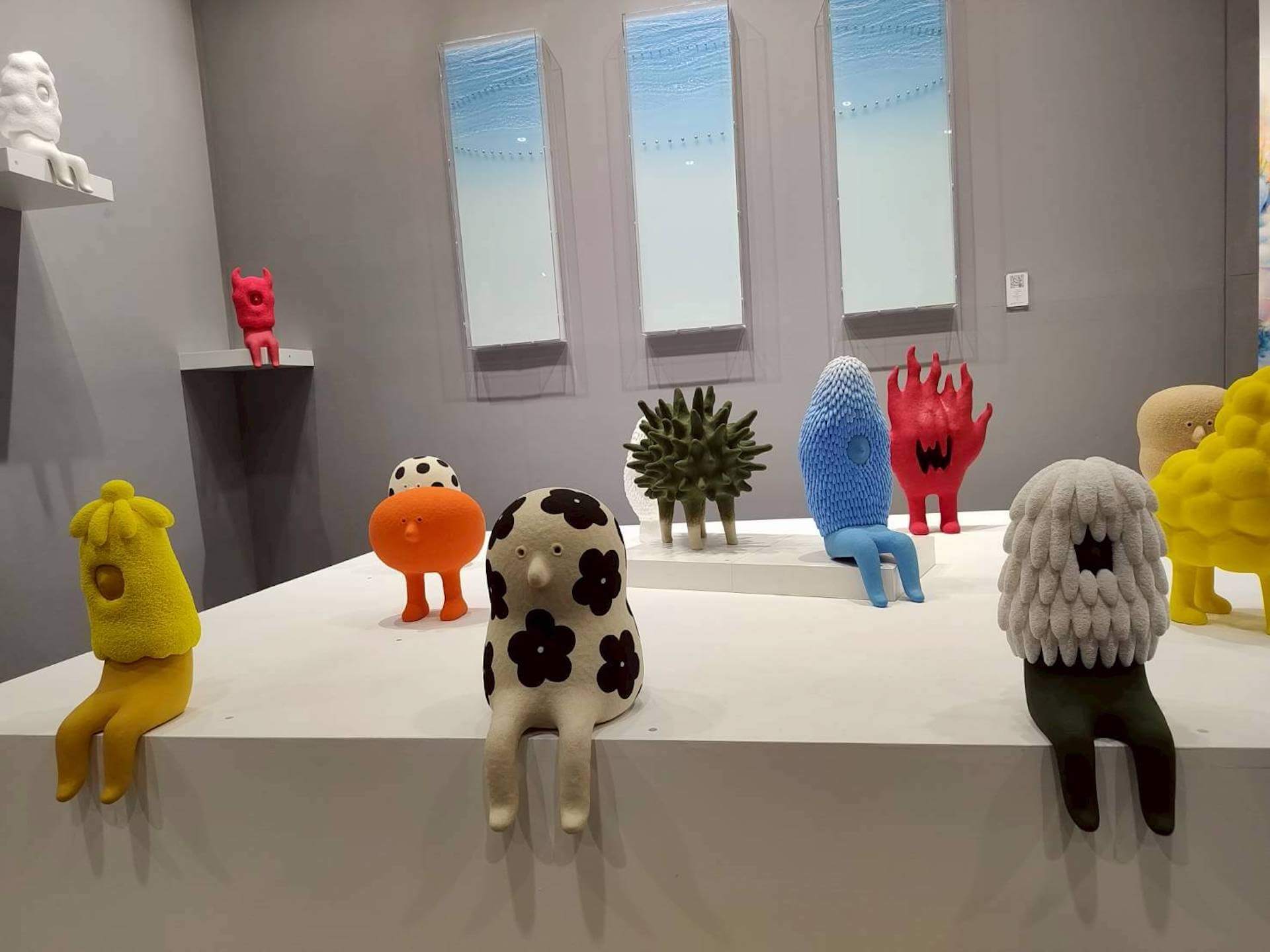 韓國藝術家鄭知淑以陶藝為主要創作媒材,她的陶作色彩鮮豔,造型活潑吸睛,第一天公眾展期就已經全數售罄。她尤其著迷於動物洗澡後甩水時毛髮的動態、泡沫、麵團、擦手巾絨毛等,生活中看似唾手可得的質地與肌理,並試圖以陶轉譯再現,透過如抹茶冰品等食物的漸層配色,結合日常物件,造就熟悉又新奇,令人目不轉睛的可愛角色,材質運用上,她結合泡沫黏土、金屬線與回收物等異材質,看似繽紛無憂的造型下,其實蘊含了有關自然界的循環、氣候變遷警訊的反思。(文/陳賦)