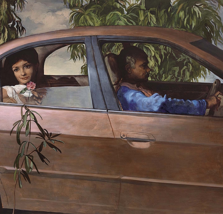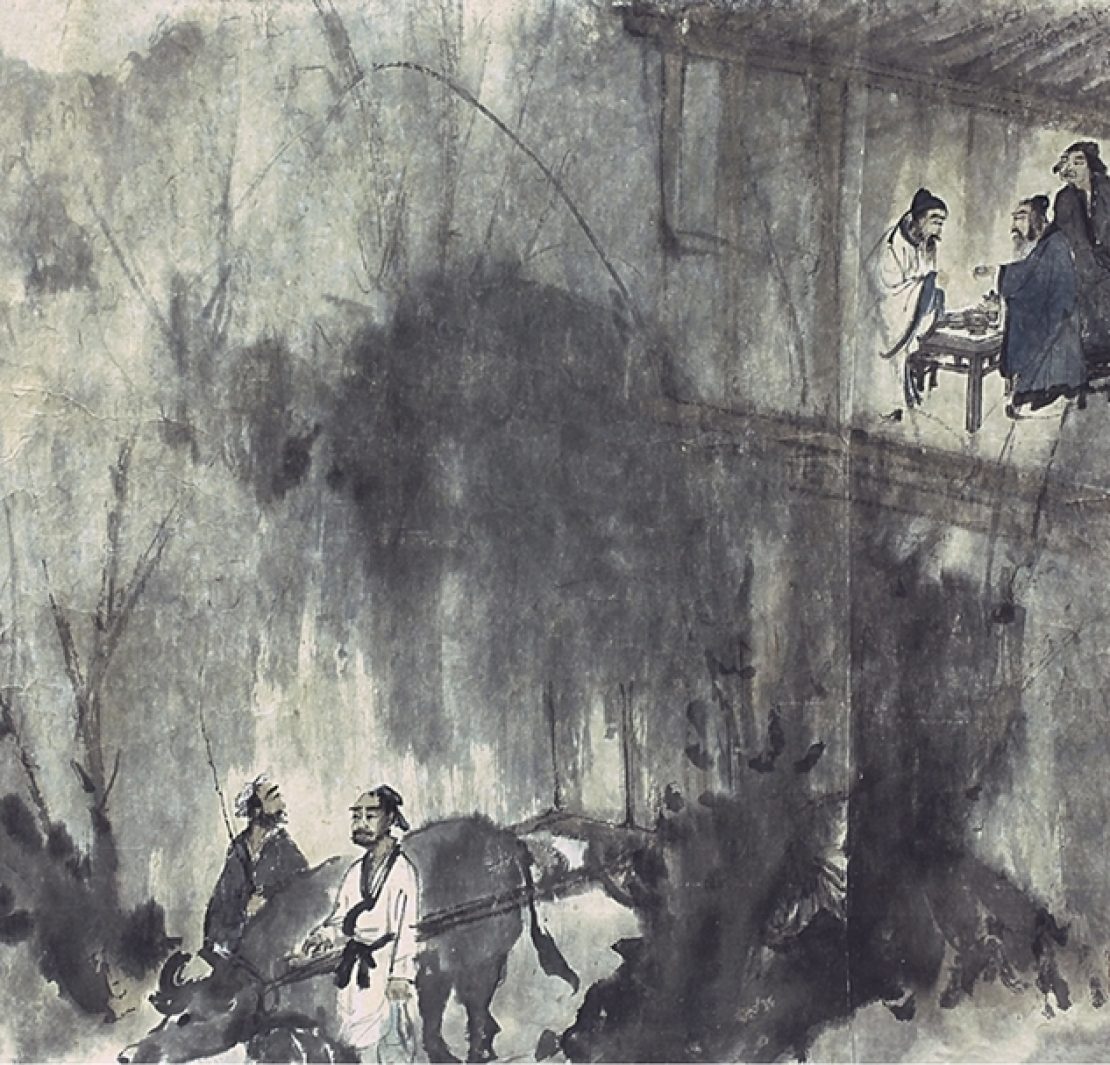 傅抱石的〈王維《渭城曲》詩意圖〉原為傅抱石畫給法國外交官Monsievr Jean Colombel,其離華之前轉贈給中國親友。Monsievr Jean Colombel對中國文化藝術十分欣賞,特別喜歡收藏傅抱石的作品。1945到1966年在中國的外交生涯中與傅抱石相交甚密,藏有眾多傅抱石作品。〈渭城曲〉原是唐代詩人王維送別友人去邊疆時寫下的一首七言絕句,「渭城朝雨浥輕塵,客舍青青柳色新。勸君更盡一杯酒,西出陽關無故人。」傅抱石用極簡的筆意將飲酒的友人與臨行的車馬在同一時空中表現出來,其他景物虛化,傳達出無限的詩意。