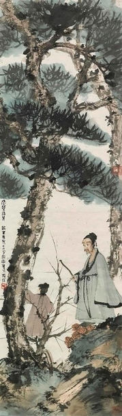 編號1431傅抱石1943年作《松下問童子》,設色紙本(未裱),鏡框,108.5×31cm,估價3,500萬至4,500萬港元,成交價4,172萬5,000港元。(佳士得香港提供)