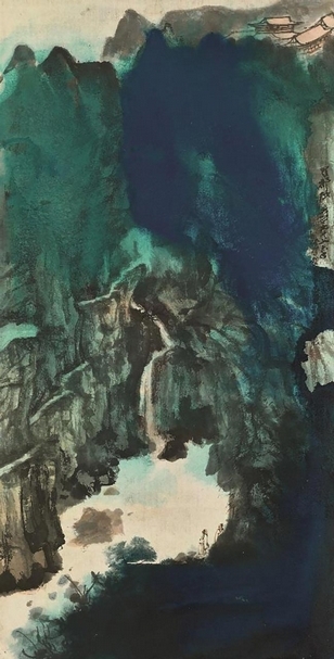 編號1379張大千1963年作《觀泉圖》,設色紙本,木板鏡框,134×68cm ,估價6,000萬至8,000萬港元,成交價6,422萬5,000港元。(佳士得香港提供)