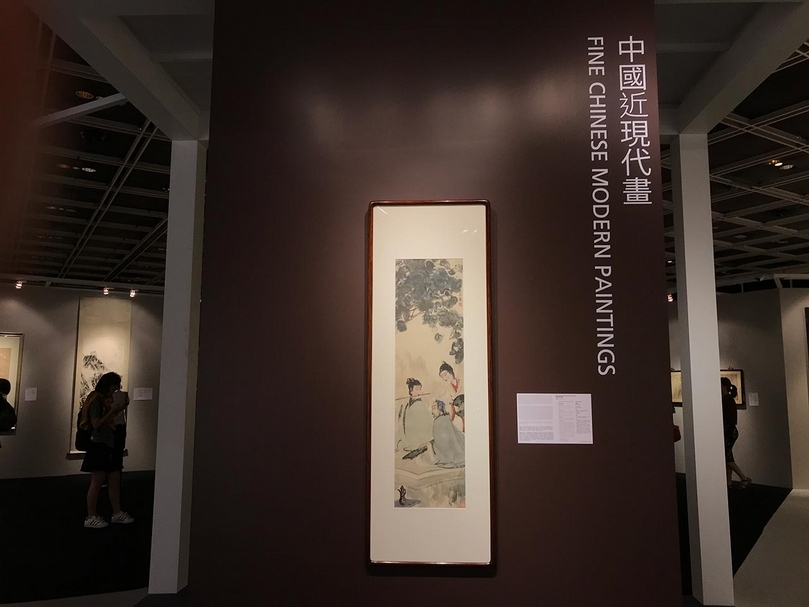 5月29日「中國近現代畫」共推355件(編號1382張大千《白荷》撤拍不列入),成交總金額4億2,347萬8,750港元,成交率約74.37%,較上一季2017年秋拍成交總額3億7,749萬6,300港元,成交率77.99%;及2016年春拍成交總金額2億9,526萬6,300港元,成交率74.33%,於金額上增長,成交率則表現持平。千萬港元價位作品有六件,張大千、傅抱石各占二席,吳冠中與齊白石各一件,然而皆為不消幾口競價即落槌,全於估價內成交且未及高估價,可見高價品略顯疲軟之姿與買家的理性。拍品價位M型化趨向明顯,高低檔價位再次拉開距離,整體氣氛謹慎,每一口間依競價階梯平穩進行,未有跳升及激情,節奏顯慢。來源清晰、流傳有緒的名家作品成為硬道理,獲得青睞。