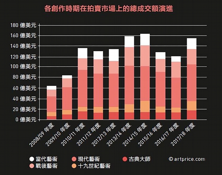 在一些指標性藝術家的帶領下,當代藝術進入了嶄新的輝煌期。如今這個時期的創作佔了純藝術銷售額的12%,無論在銷售額或是交易數量上,都超越了古典油畫大師與19世紀的作品。