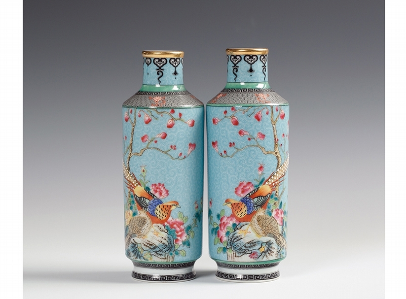 清雍正御製軋道琺瑯,彩帝雉牡丹春景燈籠對瓶,H:20cm 一對