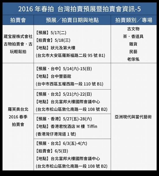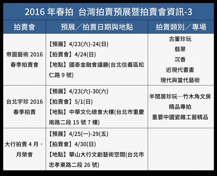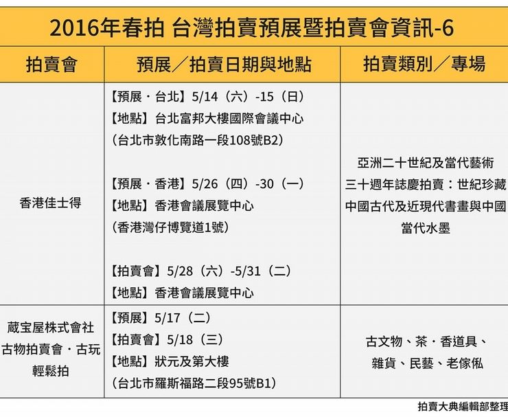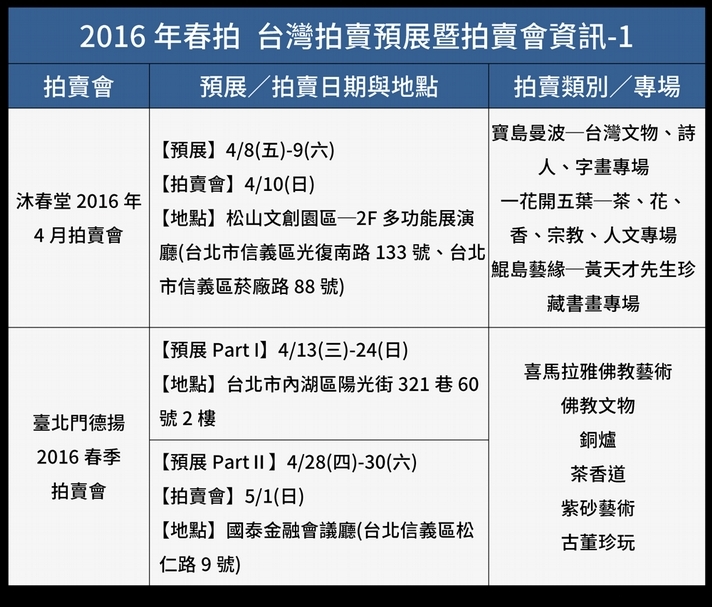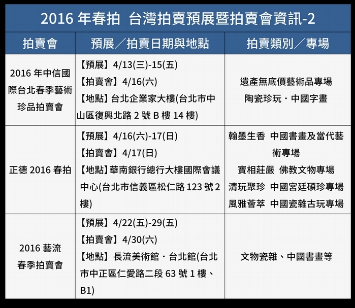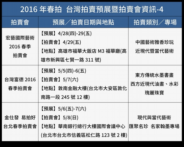 4/8更新! 拍賣動態時程表4/8更新! 拍賣動態時程表4/8更新! 拍賣動態時程表4/8更新! 拍賣動態時程表《2016年春拍 台灣拍賣預展暨拍賣會資訊》(4/8更新) 本資訊將不定期更新,對藝術品收藏、投資有興趣的您,請持續關注我們的動態! 4/8更新! 拍賣動態時程表