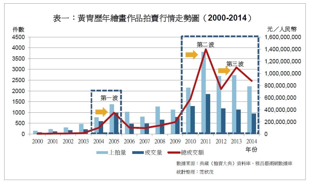 在本篇報導中,將系統性地為讀者解析黃冑繪畫作品歷年拍賣價格走勢與市場行情,其中包括歷年繪畫作品拍賣行情走勢(2000-2014)、典藏《書畫拍賣大典》─黃冑歷年作品成交紀錄前十大排行榜、黃冑繪畫作品2000-2014歷年拍賣趨勢分析,最後也為讀者解讀隱藏在拍賣數據背後的各種現象。