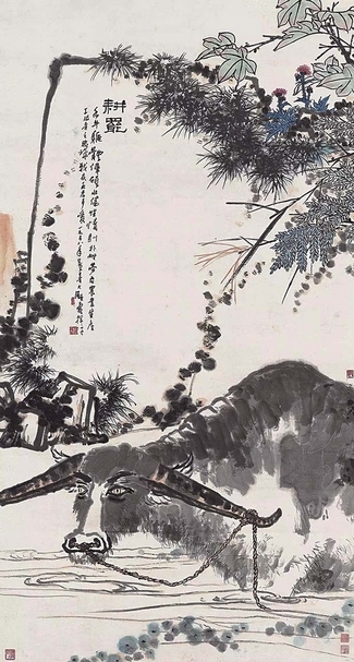潘天壽筆下的水牛題材,目前存世四幅。一幅是現藏於寧海文物管理委員會1948年以指墨創作的〈耕罷圖〉。另外三幅,除本件1958年作〈耕罷〉,還有1961年〈春塘水暖圖〉,及收藏在潘天壽紀念館的1962年作〈夏塘水牛圖〉。1958年作〈耕罷〉,潘天壽畫於八尺整張的宣紙之上,繪高石花叢掩映下,一水牛於水中靜臥。石之虛與牛之實形成對比;高石之濃墨強勁的線條與牛身之較淡墨色的暈染又一對比;筆墨上石之疏與牛身之密則是另一重對比;三重對比使得畫面層次既豐富且協調,筆墨酣暢,沉雄闊大,生機勃勃。潘天壽以隸書寫就題名,行書題款:「水牛軀體偉碩壯健,性情馴樸耐勞,為農業生產工作者之忠誠戰友,至為可愛。」對水牛的喜愛之情躍於紙上。1958年正是「改造中國畫」運動的高峰時期,潘天壽選擇水牛為表現對象,也暗合了當時的政策。2008年上海朵雲軒秋拍,成交價人民幣1176萬元。2017年中國嘉德春拍以人民幣8800萬元起拍,成交價人民幣1.5893億元,成為潘天壽第三件過億拍品。其他兩件為:2015年,中國嘉德春拍〈鷹石山花圖〉人民幣2.7945億元,同年上海嘉禾秋拍〈鷹石圖〉人民幣1.15億元。