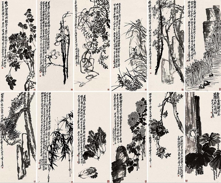 此〈花卉十二條屏〉當是吳昌碩存世最巨型的繪畫作品。吳昌碩十二條屏極罕見,原為日式六屏一雙,應是應日本友人特殊定製,即便收藏豐富吳昌碩作品的重要官方機構,如浙江省博物館、上海博物館、西泠印社、北京故宮博物院等,也無相同或相近的藏品。該作完成於1915至1916年間,是吳昌碩72、73歲,最富創造力、畫境已完全成熟的時期,所繪:牡丹、玉蘭、紫藤、蘭石、梅石、松石、白荷、石榴、菊石、白菜、叢竹、仙石,皆其畫得最多的擅長題材,最是任筆揮灑,得心應手;構圖布局多取對角斜勢,注重畫面錯綜回應,各屏條變化多端又能整齊劃一,而「重、拙、大」的金石筆法,厚重沉穩而巧拙相生,格高韻古,使觀者為之心壯。十二屏皆有長題,除紫藤單條題寫:「吳下拙政園一古藤,虞山鄒巷一古藤,相傳皆明初時所植,予曾攝影一過。」其餘11幅題自作詩,〈花卉十二條屏〉融會詩、書、畫、印四絕,成為雋永經典。於2004年中國嘉德春拍現身,成交價人民幣1650萬元,創當時吳昌碩畫作最高拍賣紀錄。2017年估價待詢,自人民幣7200萬元起拍,最終成交價人民幣1.955億元,成為吳昌碩的第一件過億拍品,締造吳昌碩個人畫價高峰。較2015年中國嘉德秋拍〈致三多花卉冊〉紀錄成交價人民幣4370萬元,大幅躍升。