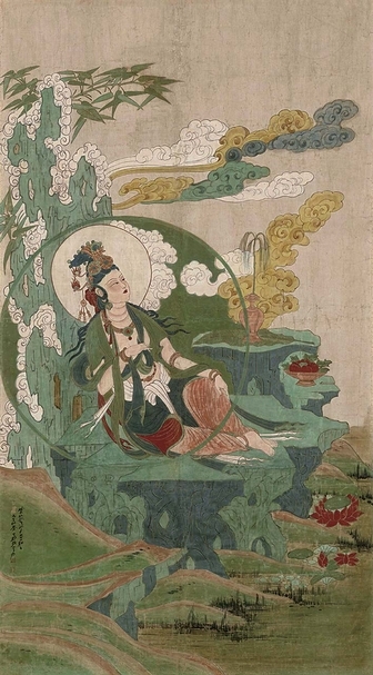 1943年5月,張大千率一眾門生弟子離開莫高窟,一路向榆林窟行進,之後一個半月,他全力投入榆林窟壁畫的臨摹之中。在此,他以西夏時期的「水月觀音像」為本所作的〈水月觀音〉,被公認為是臨摹敦煌壁畫中最具神韻之作。同年8月,張大千敦煌藝術在國內的首次公開露面,〈西夏時水月觀音〉即在「張大千臨撫敦煌壁畫展覽」中,現藏於四川省博物館。展覽後,大千再次創作〈水月觀音〉,除與「川博本」同繪於特製畫布上,並不含童子,呈豎幅構圖,更符合中堂供養的形式,且敷色更較之前精麗,使用了大量的描金,滿幅金光萬丈,熠熠生輝,盡現無上佛光,為張大千稽古敦煌後的雄心力作,堪謂對盛唐精麗畫風的極致詮釋,也是市場唯一所見工筆重彩青綠描金的水月觀音。此作經1991年美國華盛頓賽克勒美術館「血戰古人—張大千六十年回顧展」等學術展覽著錄。由北美默齋曹仲英收藏,此回釋出拍賣,以人民幣7100萬元起拍,最終成交價人民幣1.012億元,創張大千人物畫最高價。