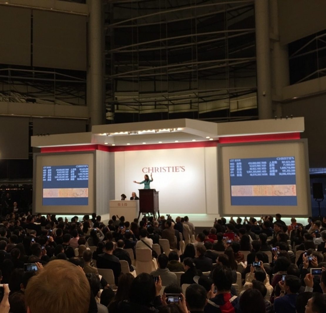 第八件拍品,蘇東坡《木石圖》上拍,本件可謂宋代文人寫意美學之始,自民國初年就僅存珂羅版,未曾有人見過真蹟,這次由日本徵得,引起各界轟動。其估價4億港元,約合5,100萬美元,其實與目前西方頂級藝術品的價格仍有差距。然而,它打破佳士得拍賣過往慣例,競標條件極為嚴苛,競拍者需繳交的1.6億港元押金,遠遠超過去年陳容《九龍圖》400萬美元(約3106萬港元)的押金紀錄外,更要求銀行提供流動資產需超過4億港元的證明。蘇東坡《木石圖》從3億港元開拍,3億9千萬港元時,香港佳士得CEO魏蔚手中電話買家開始舉牌,下一口價4億元時,另一位電話買家開始舉牌,魏蔚手中電話買家再加一口價,最終順利以4億1千萬港元得手,加入佣金後為4億6360萬港元,榮豋歷年中國古代繪畫排行榜之第一高價!拍賣結束後,魏蔚也暗示買家為藝術機構。然而,在拍賣後兩日,中國網民已沸沸揚揚地討論,據傳是由北京故宮購藏此作,若有屬實未來將在即將開館的香港故宮展出。而拍場另一件相互輝映者,為近代吳湖帆1965年作《臨蘇軾木石圖並黃州寒食帖》,本件應是在蘇軾真跡流落日本後,吳湖帆臨珂羅版至米芾跋處,再臨東坡黃州寒食帖、黃庭堅題字而成,落槌價為420萬港元。