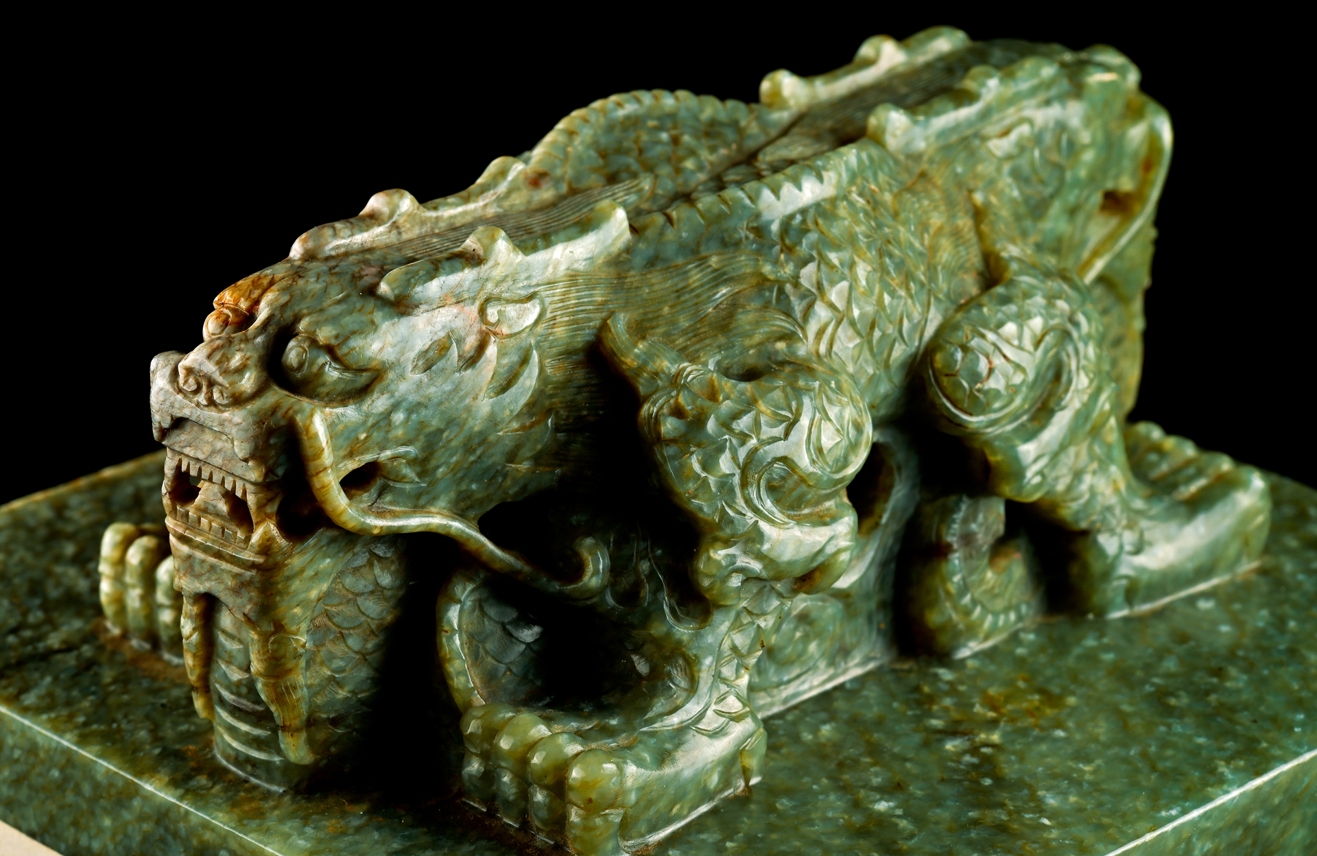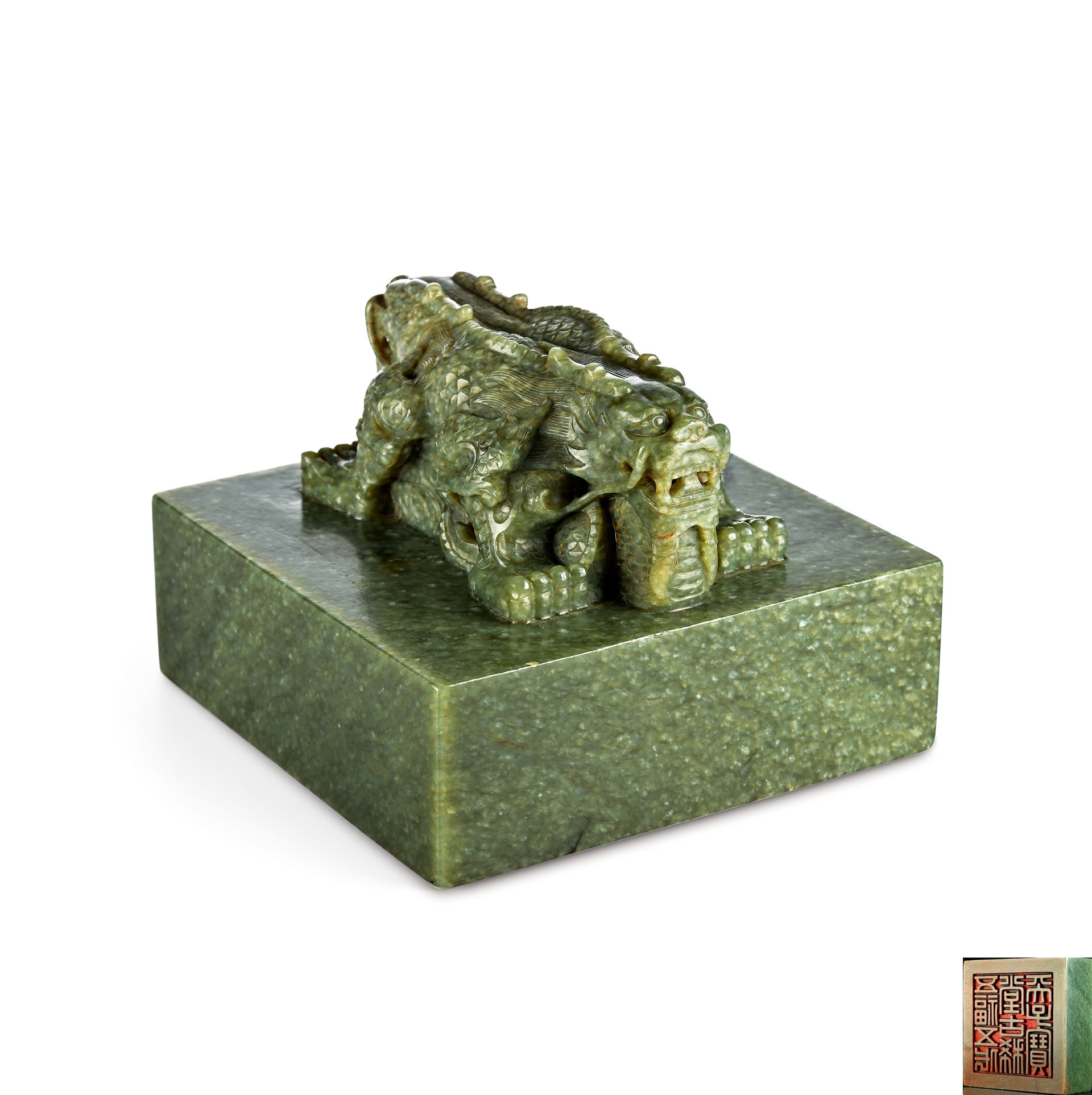 清乾隆 御製《五福五代堂古稀天子寶》交龍青玉璽,印文:五福五代堂古稀天子寶,13.1×13.1cm。(華藝國際北京提供)