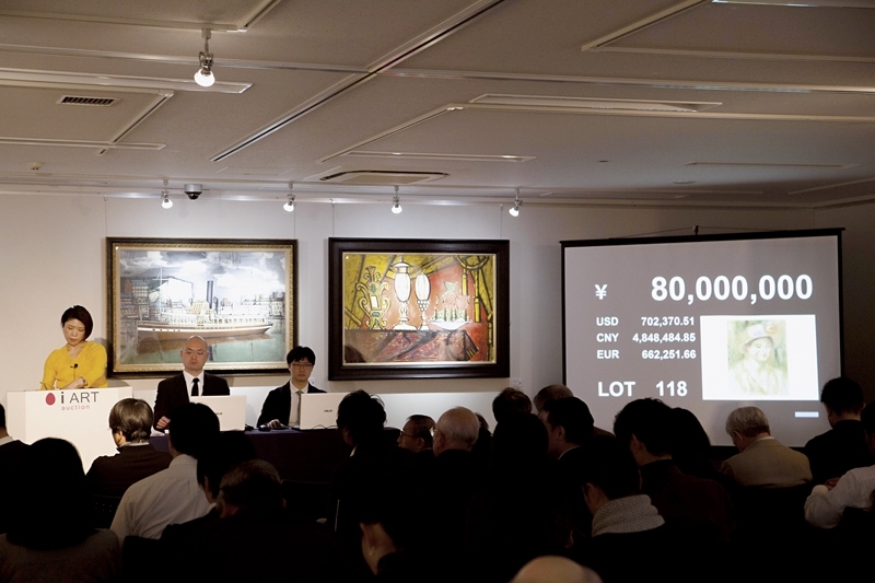 本場拍賣最精彩的高潮是在iART的主軸重點區塊,在拍賣官屏息之間,拍賣台的競拍電話已經充滿了各國語言交錯,現場藏家亦蓄勢待發。首先由藤田嗣治的作品打前鋒,其第一件上拍作品Lot90《罌粟花與蜜蜂》便是以高於估價的6倍落槌,藤田嗣治編號Lot91至93《男性像》、《小雪人》、《兩個小孩》的上拍作品也都拍得好成績。接著藤田嗣治的焦點拍品Lot93-2—這幅特別訂製所繪、曾經被美國達拉斯博物館收藏的一幅《女性肖像》油畫畫作,畫面中人物有著相當秀美的臉孔,從估價的2300萬日圓一路競價,到了3200萬日圓落槌。