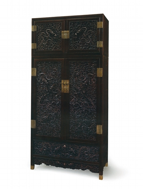 佳士得:編號962的19世紀清〈紫檀雕雲龍紋四件櫃〉,成交價60萬500美元。圖為局部。圖片提供:佳士得