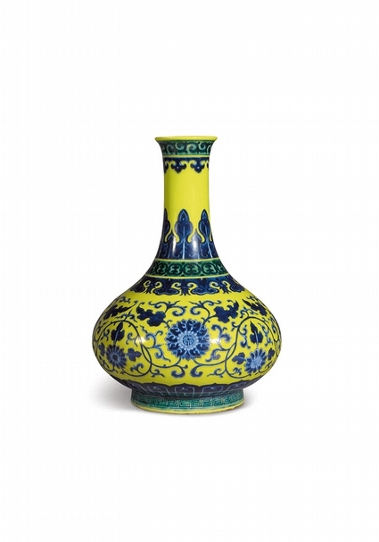 蘇富比:編號25清乾隆〈黃地綠彩青花纏枝花卉紋荸薺瓶〉,成交價111萬6500美元。圖片提供:蘇富比