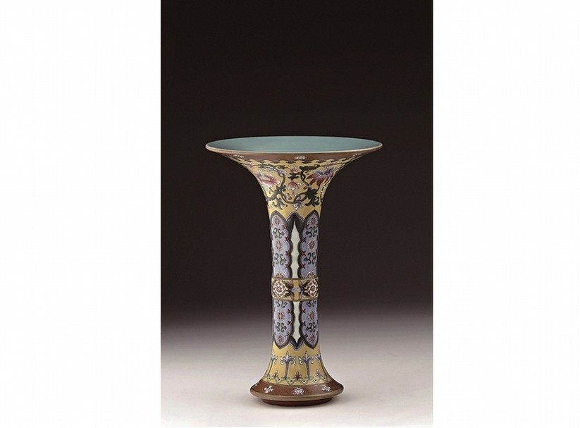 清乾隆〈粉彩黃地軋道花觚〉,高21公分。(圖︱新光國際)