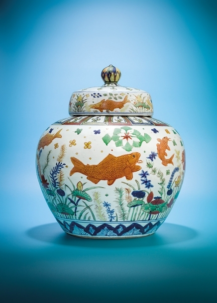 佳士得香港2017秋拍「樂從堂」收藏:明嘉靖(1522~1566)〈五彩魚藻紋蓋罐〉,六字楷書款,高46公分,估價待詢。來源:(1)胡惠春家族珍藏。(2)紐約蘇富比,1992年12月1日,拍品編號282。(3)香港蘇富比,私人基金珍藏明清御製瓷器及工藝品專場,2000年10月29日,拍品編號18。圖╱佳士得香港。