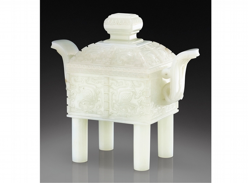 Lot 154 《仿古饕餮紋方鼎式蓋爐》清乾隆 白玉 高17.2公分 法國私人收藏