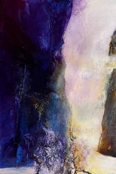 《25.06.86 桃花源》則完成於趙無極國際聲望如日中天,達行到水窮處,坐看雲起時的人生況境。作品採其創作中極為罕見的垂直三澗式構圖,透過比例大小的配置,製造出自然的空間感,當中他奔放地施以亮麗的藍紫色彩,大膽地讓它佔據畫布近乎三分之二的面積。當中,懸浮透亮的葡萄紫隨著柔韌綿延、躍動飛揚的墨黑線條由地面蒸蒸上升,和寶藍、靛青與墨色交織、迸溢出如山壁般的形象,層層向上遞嬗,蒼茫勁拔,配以點灑的琉璃金光,營造一宛如幻境的情詩。藝術家將中國傳統書畫中「墨分五色」的概念,以西方絢麗的油彩重新演繹,而在畫幅的中心偏右,他刻意製造一個以白色為基調的空間,試圖來詮釋「空」的概念,對應左半的重彩,生成「虛」與「實」之間碰撞的戲劇感,他在相異明度的白色中,融入炫麗的粉紫、鵝黃、青銅與淡藍色,透過多層次的施染、噴潑,創造出若中國水墨中對於煙雨迷離、雲靄蒸蒸特殊境象的描寫。此或體現了中國傳統道家的哲學—以謙和之心坐忘自然的美學和宇宙觀。畫境令人聯想到晉代文學家陶淵明在《桃花源記》中所描寫的「緣溪行,忘路之遠近,忽逢桃花林,夾岸數百步,中無雜樹,芳草鮮美,落英繽紛,漁人甚異之,復前行,欲窮其林。林盡水源,便得一山,山有小口,彷彿若有光」的情思,以及張大千完成於1982年的潑彩巨制《桃源圖》。張大千在50年代中期從細筆轉向粗筆、潑墨,1960年代初期成就潑彩,此與趙無極從具象轉到抽象的創作轉折或互有啟發,兩者同為勇於突破自我的藝術家。兩件作品,雖一以中式墨彩,一以西式油彩為材,但在構圖與設色上卻展現了有趣的對話,別有況味地言說了自我對於頓離塵世之境的豐美想像。