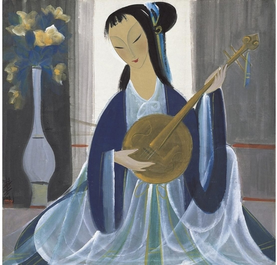 林風眠《仕女彈阮圖》.彩墨、紙本.68×68 cm.1950。