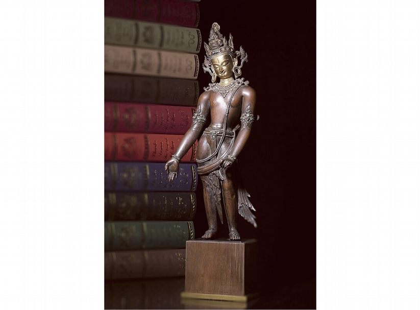 14世紀〈尼泊爾銅泥金蓮花手菩薩像〉,高35公分。來源:The Carter Burden Collection。紐約蘇富比1991年3月27日拍品編號101。
