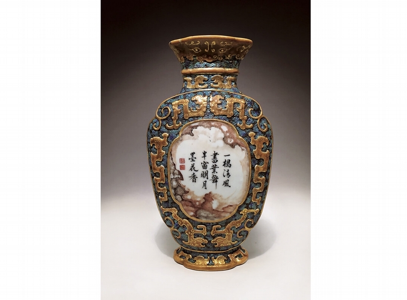 清乾隆〈唐英製仿青銅釉浮雕夔龍紋描金開光木紋釉詩文壁瓶〉,「乾隆年製」款,高21公分,國營文物商店舊藏。
