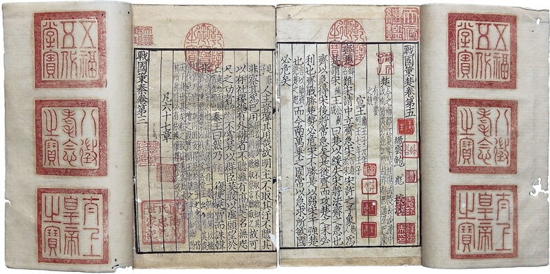 南宋鮑彪校注《戰國策》存卷三、卷五。鈐印:「鳳陽萬氏忠節世家記」、「明浙江都指揮萬表民望書籍」、「汪繼美印」、「愛荊永藏」、「就李愛荊汪繼美珍藏」、「荊筠山人」、「筠居子」、「天祿琳琅」、「天祿繼鑒」、「五福五代堂寶」、「八徵耄念之寶」、「太上皇帝之寶」、「乾隆御覽之寶」、「于懷」、「康生」、「歸公」、「戊戌人」、「鄧拓」、「鄧拓珍藏」。曾經:萬表(明正德)、汪繼美(與項元汴同時)、天祿琳琅、于懷、鄧拓、康生遞藏。著錄於:《欽定天祿琳琅書目續編》卷四,宋版史部。《故宮已佚書畫目錄三種》之《賞溥傑書畫目錄》(八月初六日)。《故宮已佚書畫目錄三種》之《收到書畫目錄》(十一月二十三日)。《歷代珍稀版本經眼錄》第39頁。《第二批國家珍貴古籍名錄》第02834號。