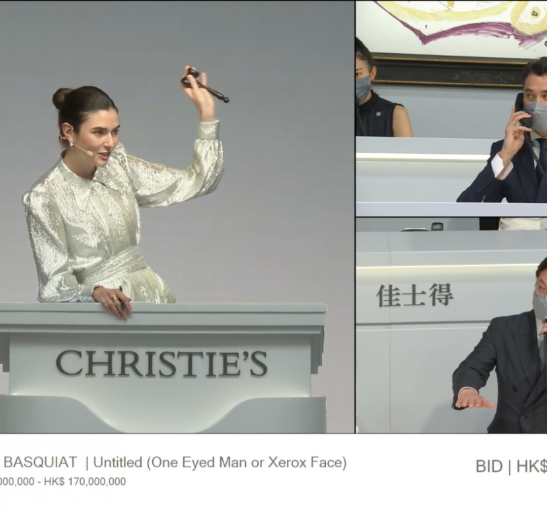 整體而言,佳士得此次夜拍表現可圈可點,將近九成的作品以高於均估價的價格成交,更有26件作品(36%)以超過均估價2倍的價格成交。作為下半場焦點,近來市場熱度不減的巴斯奇亞《無題》從一開始便獲得來自現場拍賣室、香港與紐約電話的競投,1億2千萬港元起拍,該作迅速超過拍前低估價1億4千萬,在紐約電話競投退出後,最終便在由亞太區總裁龐智鋒(Francis Belin)與現代及當代藝術部主席張丁元分別代表的電話競投,以100萬港元一口的叫價纏鬥長達十多分鐘,最終由龐智鋒以2億2百萬港元的落槌價(2.343億成交),為編號8216號的買家投得。