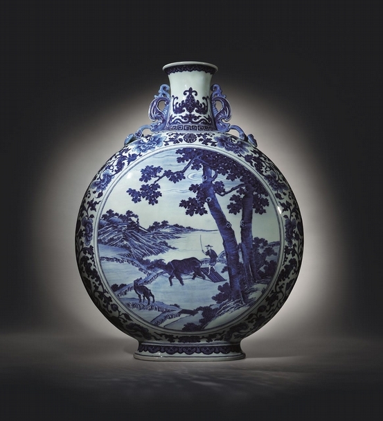 編號2751清乾隆《青花春耕圖雙福如意大抱月瓶》,六字篆書款。成交價6,985萬港元。(佳士得香港提供)