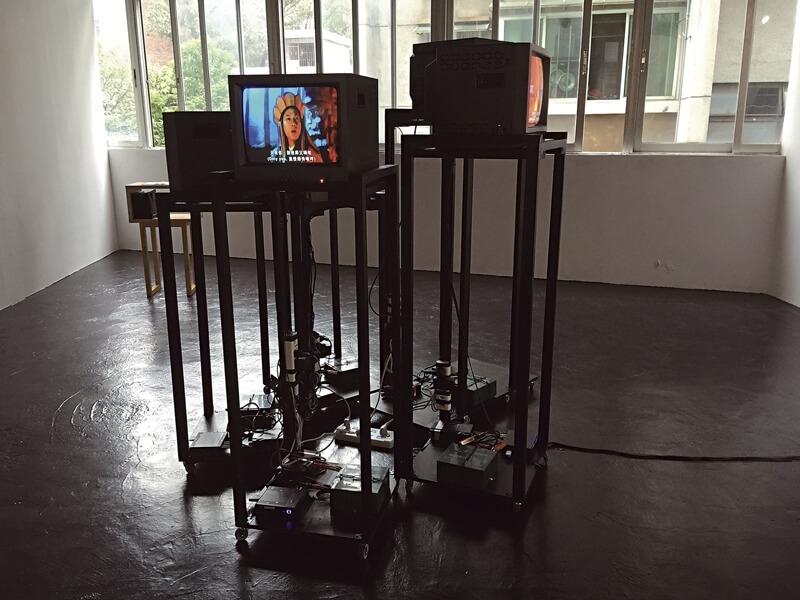 「低緯度的不透明」的展覽一共展出五位藝術家作品,展覽雖然小,但卻非常完整。從架上繪畫到影像、裝置、現場行為表演,應有盡有。其實原來應該是六位藝術家,最後一位未能參展的藝術家是一件木質裝置作品,由於從香港進中國內地需要報關審批,木質作品沒通過,因此未能如期而至。