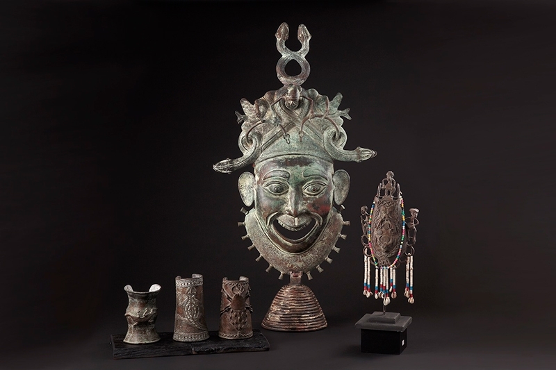 喀麥隆 巴蒙族 王室藝術/臂釧. 姆貝銅肖像. 酋長背袋(左至右)