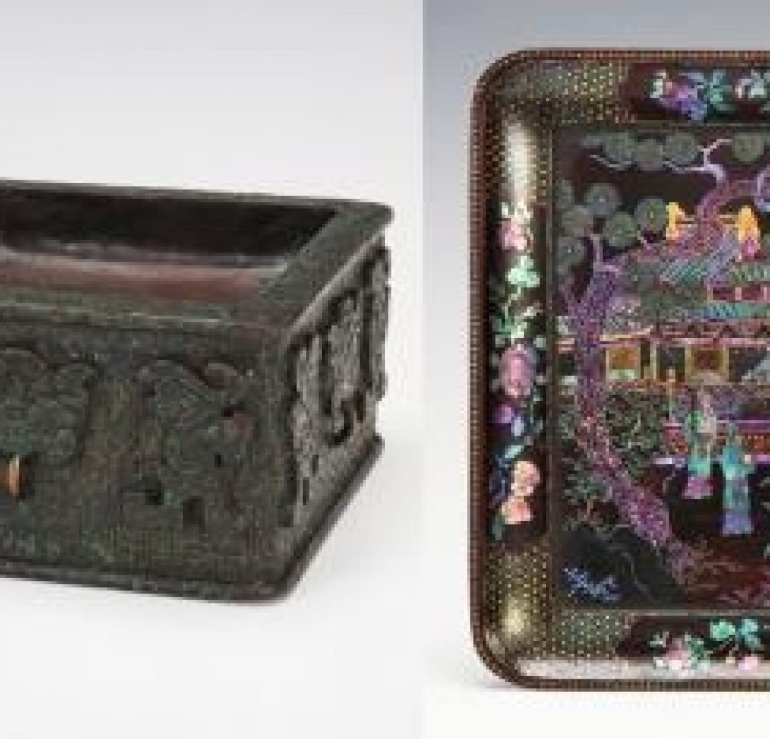左:周顥款紫檀嵌百寶四方筆筒。中:御題獸面紋仿古青銅端硯。右:黑漆螺鈿瑤池賀壽方盤。圖片提供:日本伊斯特拍賣