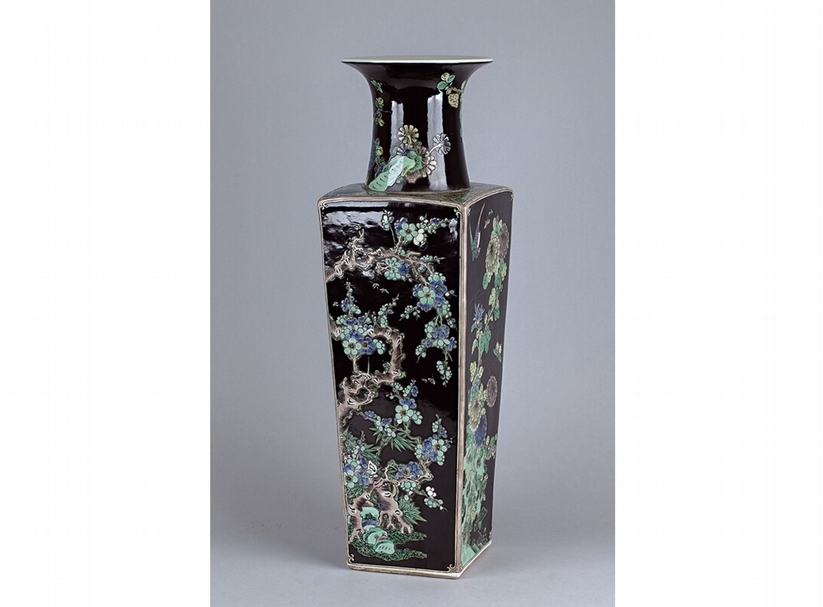 清〈康熙黑地素三彩花鳥紋四方棒槌瓶〉,高50公分。